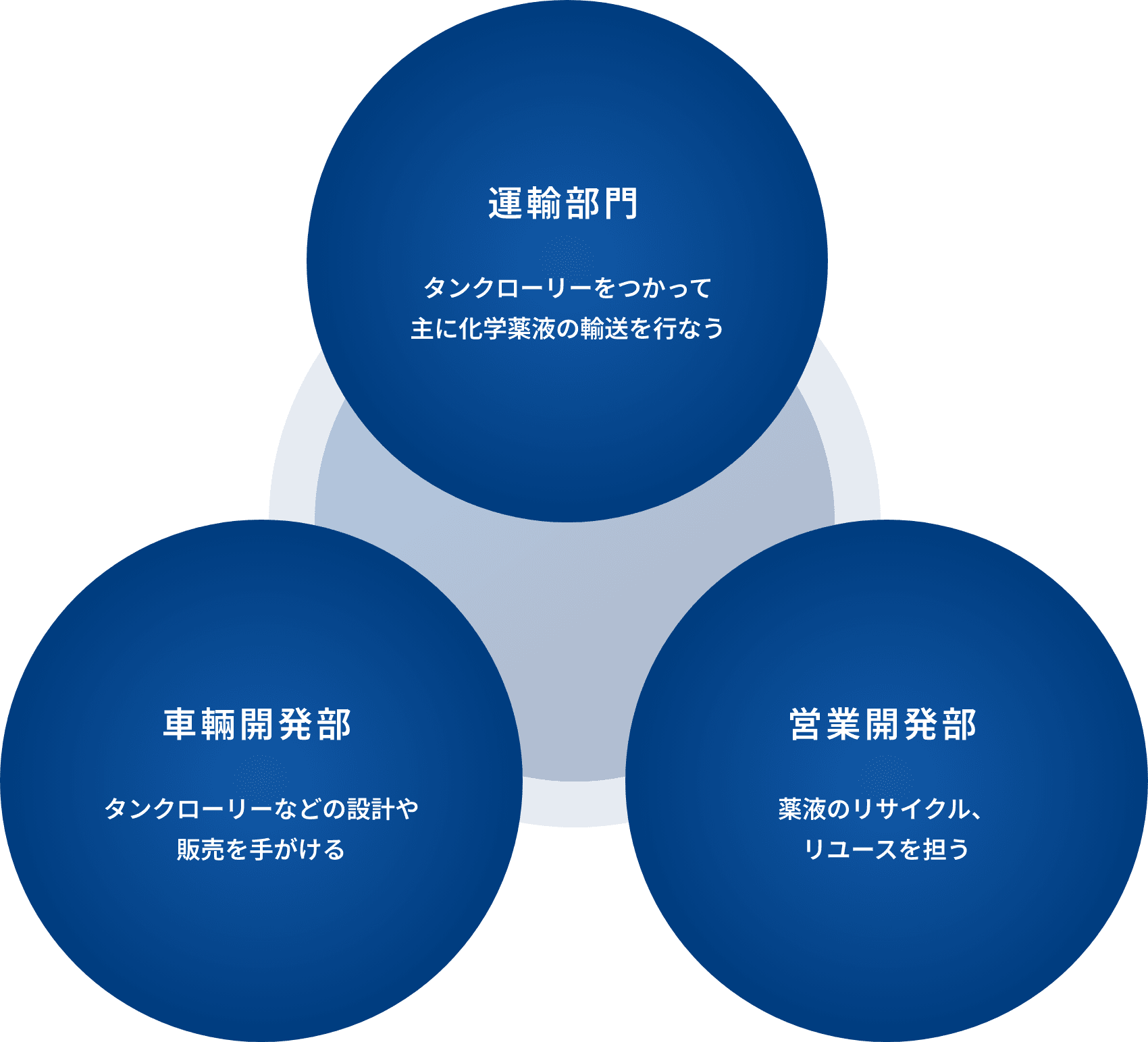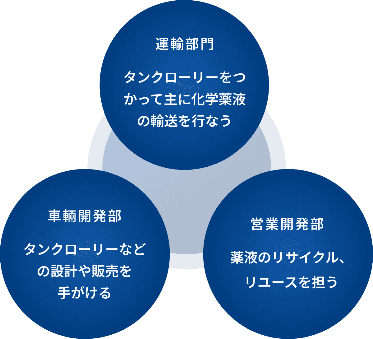 私たちの強みは、単なる運送業に留まらない「多角的な専門性」にあります。国内有数のシェアを誇る「運輸部門」を核に、自社でタンクローリーを設計・製造する「車輛開発部」、そして薬液のリサイクルを担う「営業開発部」の3つの機能を保有しています。